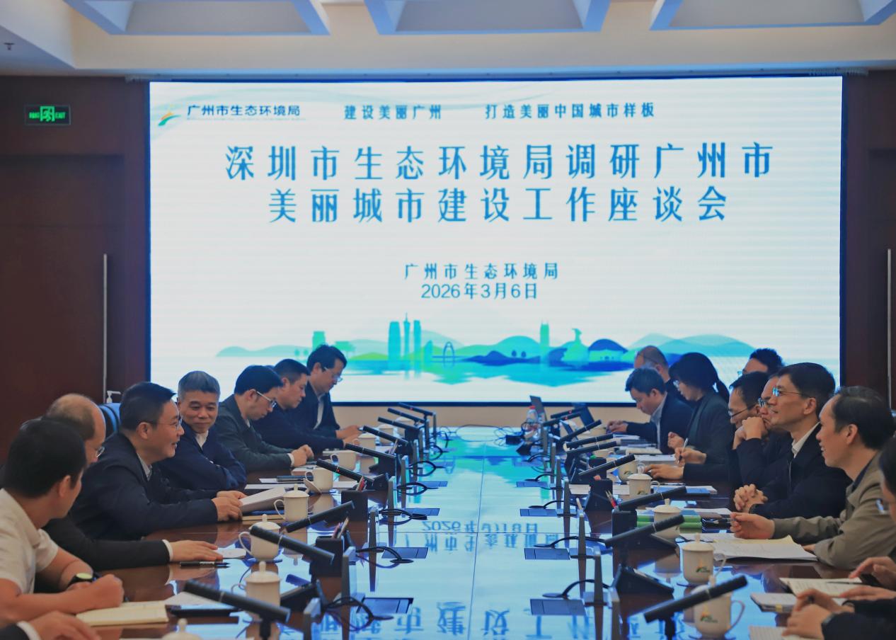 座谈会上,广州市生态环境局相关处室就美丽广州建设、“十五五”规划编制、“十五运”环境质量保障、生态环境信息化建设和人工智能技术应用、机构设置与条块管理、党建业务融合发展等方面作了详细介绍,双方开展深入探讨并交换了意见。广州市生态环境局党组书记、局长王保森对调研组一行表示欢迎,他表示,近年来深圳市立足先行示范区定位,在打造高品质生态环境、改革创新、绿色低碳转型等领域走在前、作示范,为全省生态环保工作提供了重要经验,值得广州学习借鉴,希望未来能继续加强交流合作,实现优势互补、互利共赢。刘德峰书记表示,广州、深圳同属超大型城市,近年来广州先行先试、大胆探索,在美丽城市建设、“美丽全运”保障、科技赋能生态环境治理、“党建红”引领“生态绿”等方面成效显著,形成了诸多特色鲜明、务实管用的创新举措,深圳将学习吸收广州的先进经验,全面提升美丽城市建设水平。同时,热切期盼两市进一步深化协作联动,持续拓宽合作领域、细化合作举措,携手推动广州、深圳共保联治向更深层次、更宽领域、更高水平迈进。
