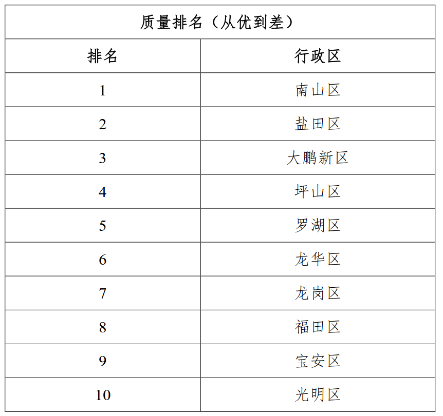 按照我市水污染防治目标责任书地表水水环境质量考核断面监测结果,2018年第三季度,南山区、盐田区、大鹏新区、坪山区河流水质总体良好,达地表水Ⅴ类及以上,位列前四。