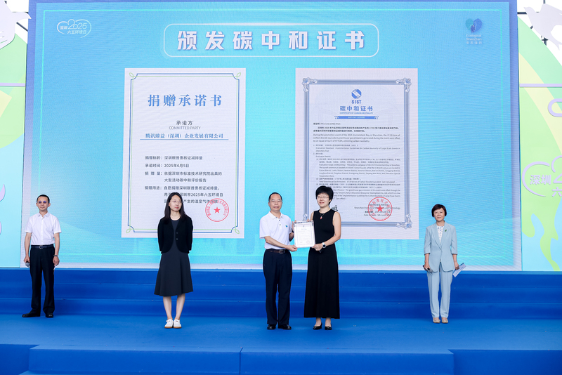 活动现场举行了碳中和证书颁发仪式。捐赠单位腾讯臻益(深圳)企业发展有限公司,碳中和评价服务方代表深圳市标准技术研究院,活动承办方代表深圳市生态环境智能管控中心,市人大代表、市人大环保代表专业小组组长陈寿,市政协委员、红树林基金会联合发起人副理事长孙莉莉共同上台见证。经预核算,本次活动举办期间碳排放量为17.59吨二氧化碳当量,将全部由腾讯臻益(深圳)企业发展有限公司捐赠的深圳市碳普惠核证减排量进行抵销。